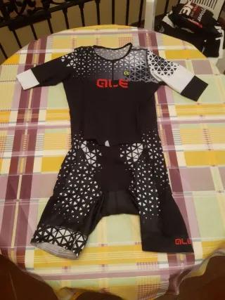 Mono de ciclismo Ale con un diseño moderno y detalles geométricos. Solo una puesta. Pasa por nuevo. - Mangas cortas. - Combinación de colores negro y blanco. - Logotipo de Ale en la parte delantera y en la pierna. Gobik. Ale. Sportful. Gsg. Siroko. Assos. Castelli. Le col. Faster wear.