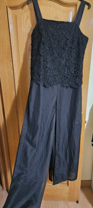 Elegante mono largo de fiesta. - Diseño con top de encaje. - Pantalón ancho y fluido. - Tirantes finos.