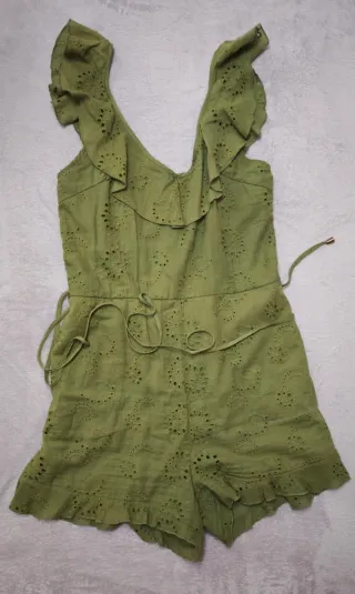 Mono corto de color verde con detalles calados y volantes. - Diseño con escote en V. - Cintura ajustable con cordón. - Tirantes con volantes. - Bajo con volantes.