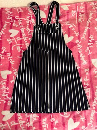 Dos monos estilo vestido, con rayas blancas y negras. Uno es de tela más gruesa y el otro de tela vaquera. Ambos están en buen estado. - Diseño de tirantes. - Corte a la altura de la rodilla. - Estampado de rayas verticales. - Mono rayas balncas y gris del Zara - Mono marino del Bershka  12€ total, (6€ und)