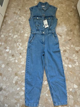 Mono vaquero de la marca Zara. Diseño moderno y cómodo. - Confeccionado en tejido vaquero. - Cuello camisero. - Cierre de botones. - Bolsillos en el pecho y laterales. - Cintura marcada. - Talla XS.