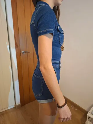 Mono vaquero corto sin estrenar, con etiqueta. Diseño moderno y cómodo. - Cierre de cremallera frontal. - Dos bolsillos en la parte delantera. - Cintura elástica para un mejor ajuste. - Manga corta.