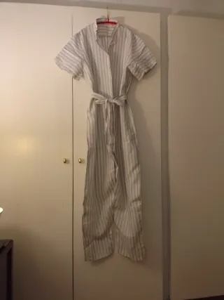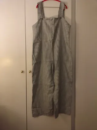 Mono largo de lino con un diseño de rayas verticales. - Cintura elástica con cordón. - Cierre de botones en la parte delantera y cremallera - Mangas cortas.