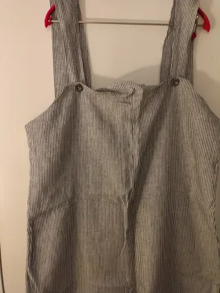 Mono vaquero largo con un diseño moderno y desgastado. - Bolsillos delanteros y traseros. - Tirantes ajustables con botones. - botones laterales. -un tirante de la parte del botón esta roto pero funciona bien.