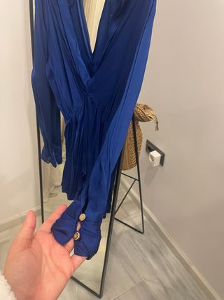 Mono de manga larga en un vibrante color azul eléctrico. El diseño presenta un escote pronunciado y detalles fruncidos en los puños con botones dorados. - Manga larga. - Escote en V. - Puños abotonados.