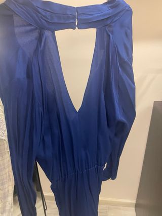 Mono elegante de color azul, ideal para celebraciones especiales. - Diseño con escote pronunciado. - Piernas anchas y fluidas. precio original 120€