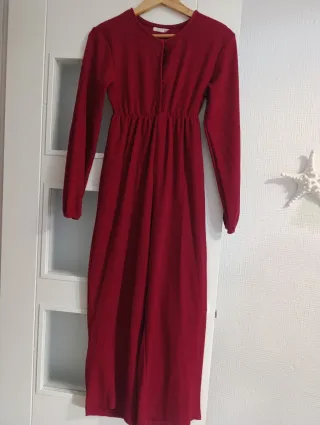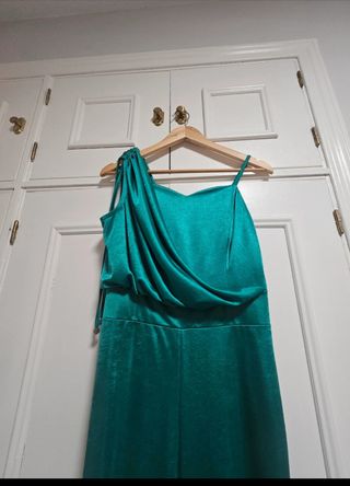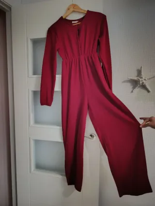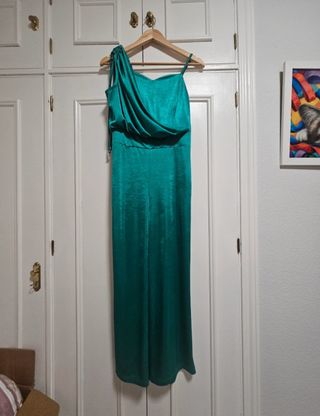 Mono largo de escote recto con pliegues y hombros descubiertos. Bolsillos de plastrón en espalda. Bajo acabado en elástico. Cierre lateral con cremallera metálica y corchete. Me lo regalaron sin ticket y esta sin estrenar. Me he hecho fotos para que se vea puesto. ( No incluye complementos)