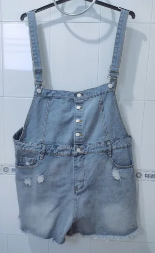 Mono corto vaquero, diseño peto, de mujer. En la etiqueta pone talla 2XL pero es como una 52-54 (pueden comprobar medidas con el metro). Marca Shein. Composición de la tela 85% algodón y 15% poliéster. En perfecto estado, como nuevo. Cinco bolsillos. Cierre abotonado y con cremallera. Cintas ajustables. Estilo moderno con detalles desgastados y desflecados. Color azul claro. Más cosas en mi perfil: Ropa mujer talla grande verano cómodo jeans denim