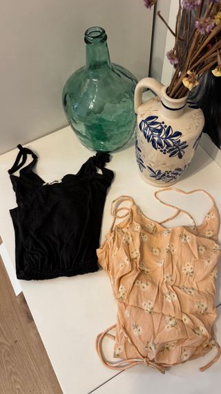 Mono largo de color beige, estampado floral y otro animal print. Ideal para un look cómodo y casual. Presenta un diseño elegante con detalles fruncidos en la parte superior. - Con bolsillos prácticos ( Beige y floral). - Tirantes finos. Cada mono 8€.