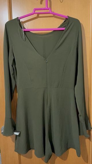 Mono de estilo militar en color verde. Presenta un diseño con cuello camisero y cierre de botones. - Dos bolsillos en el pecho con solapa. - Dos bolsillos grandes en los laterales. - Detalle de trabillas en la cintura. - Botones metálicos. - Sin mangas. Llega debajo de las rodillas,perfecto estado,elástico