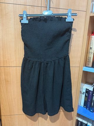 Mono corto negro con un diseño fruncido en la parte superior. - Tejido elástico y cómodo. - Estilo sin tirantes. - Falda corta con vuelo.