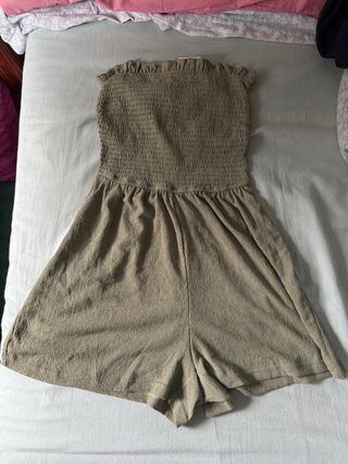 Mono corto de tela ligera, ideal para el verano. - Diseño sin tirantes con elástico. - Cintura elástica. - Piernas cortas tipo short.