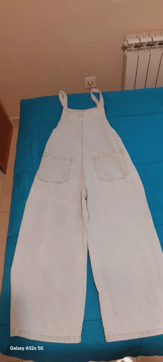 Mono vaquero ancho de Stradivarius en talla XL, pero talla pequeño sería una L. Poco uso, presenta una decoloración en la tela, casi no se nota (adjunto foto). Medidas: Ancho cadera 46 cm. Ancho pata 30 cm. Largo 118 cm. - Diseño de peto. - Cierre de botones laterales. - Bolsillo en la parte delantera.
