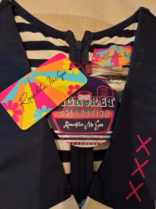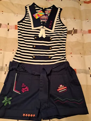 Mono corto de la marca Rosalita McGee, sin estrenar. Diseño marinero con detalles náuticos. - Estampado de rayas marineras. - Cuello estilo marinero con detalles. - Doble fila de botones dorados. - Cinturón de tela a juego. - Bolsillos