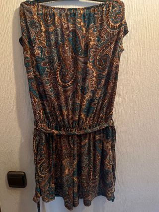 Mono corto con estampado paisley en tonos marrones y turquesas. Ideal para el verano. - Diseño sin mangas. - Cintura elástica. - Volante en el escote. - Bolsillos laterales. - Cinturón a juego.