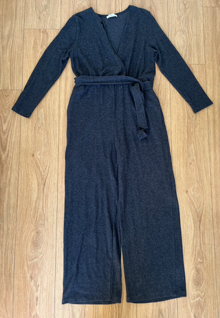 Mono largo en color gris oscuro de manga larga de Mango. Escote cruzado en “V” muy favorecedor, con goma en la cintura y bolsillos. Lleva cinturón a juego que se puede poner o no. Es de corte largo, de pierna ancha, elegante y cómodo. Tejido suave, ligero y con caída fluida. ✨ Color: gris oscuro ✨ Marca: Mango ✨ Talla: L ✨ Medidas: hombros 44cm / axilas 53cm / largo 160cm / largo manga 62cm / cintura 46cm / pierna 38-44cm / caderas 57-67cm / tobillo 69cm ✨ Composicion: 55% algodon, 43% acrilico, 2% elastano
