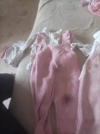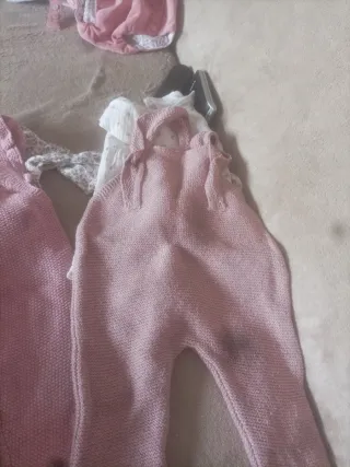 Conjunto de ropa para bebé. - Mono de punto rosa. - Blusa blanca con estampado floral.