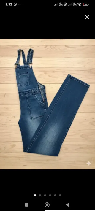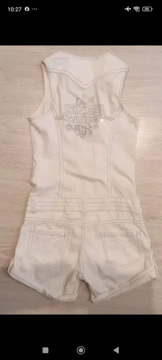 Mono vaquero de color blanco con un diseño moderno y detalles de volantes. - Tirantes anchos con volantes. - Bolsillo en la parte delantera. - Cierre lateral con botones. - Talla 11-12 - 152cm