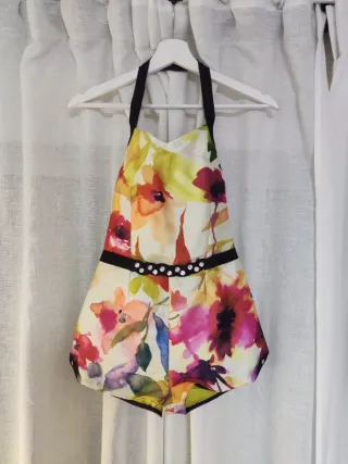 Mono de diseño único con un vibrante estampado floral. Presenta un elegante cinturón morado adornado con pedrería. Usado una vez. - Espalda abierta. - Cinturón con detalles de pedrería. - tirantes atado al cuello Pecho 35; cintura 30; largo pantalón 28 cm Largo total 53 cm + tirante