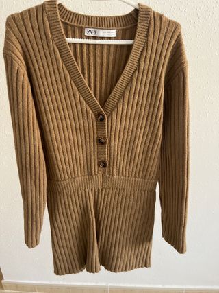Mono corto de Zara con tejido de canalé. - Manga larga. - Cuello en pico. - Cierre de botones. - Cintura elástica.
