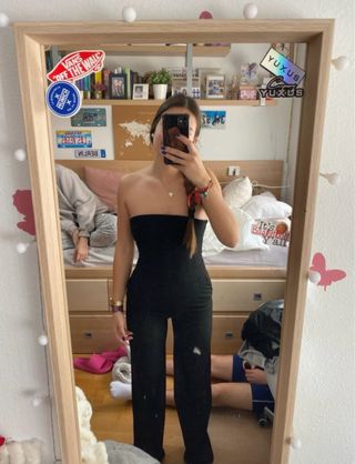 Mono largo de corte recto y diseño sin tirantes. Una prenda versátil y sofisticada. - Tejido suave y cómodo. - Cintura entallada. - Piernas anchas.
