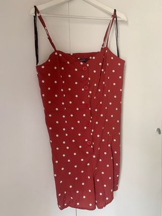 mono de verano de tejido tipo crepe con forro de algodon, es rojo ton topitos blancos y es de talla L, se abrocha por detras con una cremallera. #mono #verano #ropafresca #prendafresca #rojolunares #topos #topitos