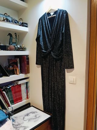 Mono largo de H&M con un diseño brillante y elegante. El tejido tiene un efecto metalizado que capta la luz. - Escote pronunciado en pico. - Detalle fruncido en la cintura. - Manga larga. - Corte recto en la pierna. Corchete par escote