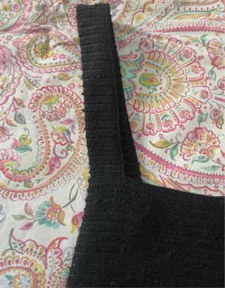 Peto corto de tejido texturizado con un diseño moderno. - Dos bolsillos frontales con ribete. - Tirantes anchos. - Bajo con acabado deshilachado. - Cierre con cremallera lateral y botones interiores en las tirantas. - Forro negro - Tiene una pequeña mancha en el forro a la altura del pecho (al ser interior no se ve)