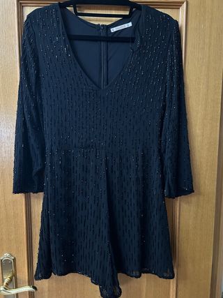Mono fiesta (fin de año, discoteca…) color negro con lentejuelas. Parte de adelante con falda, pantalón incorporado. Talla M, usado una vez, marca FB sister. Marca New Yorker. Venta en persona en Vigo.
