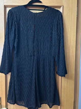 Mono corto de fiesta con detalles brillantes. Ideal para eventos especiales. - Diseño con escote en pico. - Manga larga. - Adornado con pequeñas cuentas. - Cierre de cremallera en la espalda.