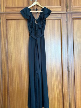 Elegante mono de fiesta en color negro, talla S. Perfecto para eventos especiales. - Mangas largas de tul con topitos. - Detalle de volantes en el pecho. - Piernas largas y ajustadas.