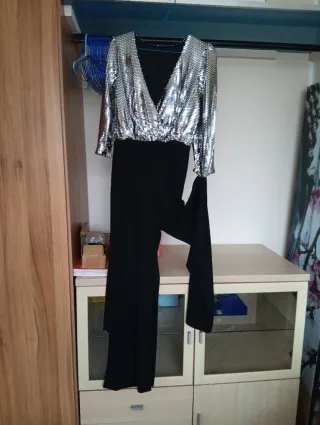Elegante mono de fiesta con un diseño llamativo. - Parte superior con lentejuelas plateadas. - Pantalón largo de color negro.