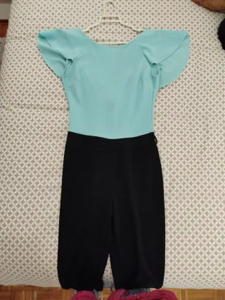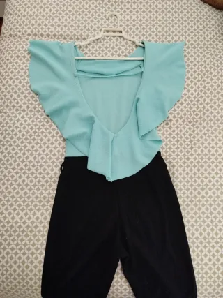 Mono de fiesta de confección con manga corta y pantalón largo. - Diseño elegante con espalda abierta y volante por detrás. - Combinación de colores negro y turquesa. - Talla S. - Solo tiene una puesta.