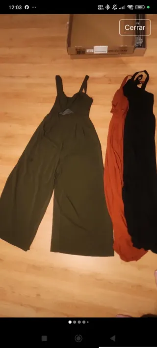 -Mono corto negro raso talla L manga larga -Vestido fiesta elástico fruncido talla L de shein color rosa colorete mangas anchas de gasa y escote en v -Vestido camisa marrón talla L manga larga - Vestido estampado de raso manga lsrga en tonos azul marino VENDIDO 7€ cada uno