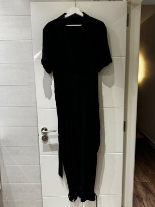 Mono largo de color negro. Presenta un diseño elegante y moderno. - Manga corta. - Cuello camisero. - Cinturón. - Bajo con cintas Puesto una sola vez
