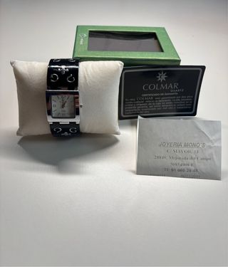 Reloj de pulsera Colmar con caja y brazalete. - Diseño moderno con detalles en negro y plateado. - Incluye su caja original, cojín y tarjeta de garantía. - Certificado de garantía de la Joyería Mono's con fecha 26/11/2011. ✅ Esta como nuevo 🚚Envio 24/48 horas ❓ Cualquier duda no dude en preguntarme