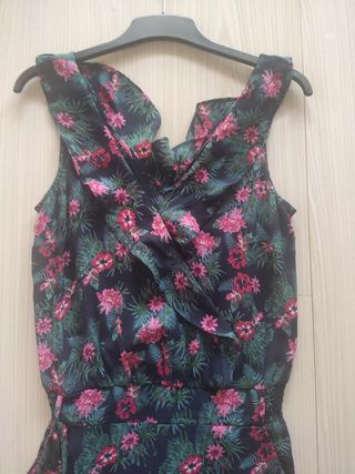 Bonito y elegante mono juvenil para chica. Alegre estampado floral. Talla 42. Marca: Fórmula Joven del Corte Inglés. Manga caída con dos volantes. Metal dorado en cintura, simulando cinturón. Cremallera larga trasera. Género fino con caída. Gran calidad. Está en perfecto estado. Sólo puesto dos veces y se quedó pequeño.