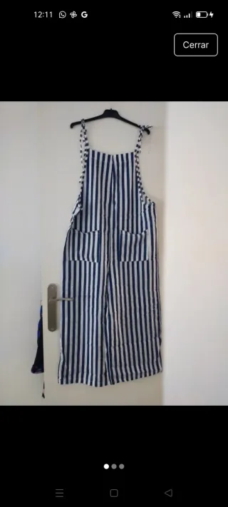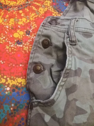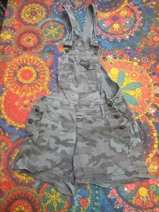 Peto corto con estampado de camuflaje, ideal para el verano. Pone talla XS, pero es una S ancha. Para alguien que tenga una M no lo recomiendo. Lo usé pocas veces precisamente por qué me quedo pequeño muy rápido. He usado como mucho 10 veces, es un buen material tipo jean/tejano. - Diseño de tirantes. - Bolsillos delanteros y traseros. - Cierre lateral con botones. Me costó 45 euros.