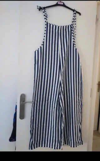 Mono de verano estilo palazzo con un diseño de rayas. - Tirantes ajustables. - Bolsillos delanteros. - Pierna ancha.
