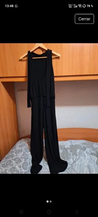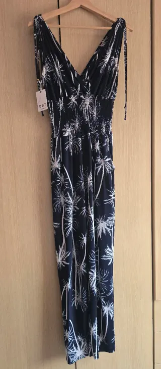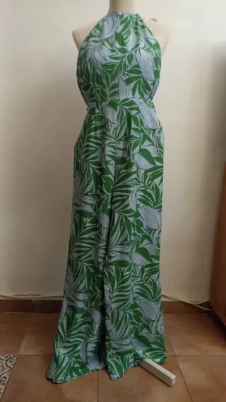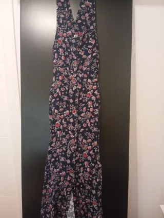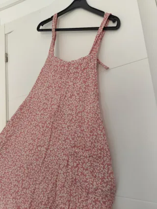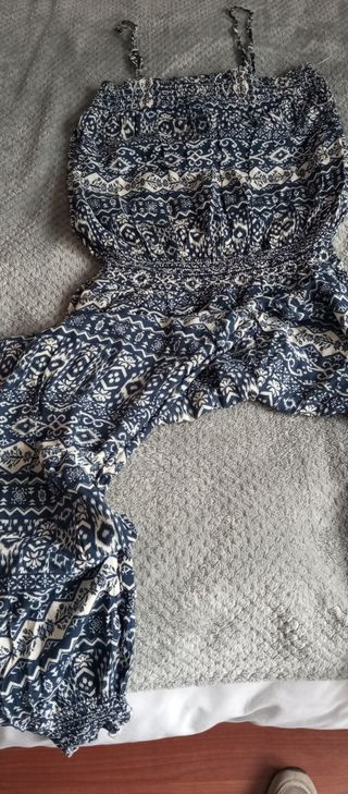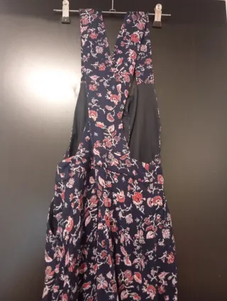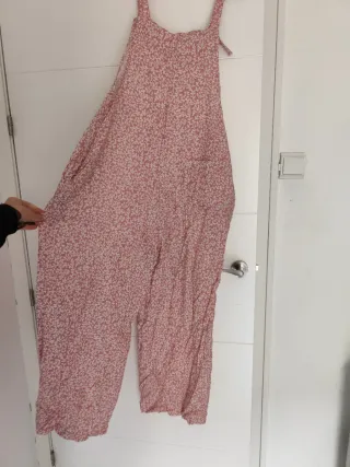 Mono largo de verano con estampado floral. - Tirantes ajustables con lazada. - Piernas anchas y fluidas. - Bolsillos laterales y uno frontal - Ancho puede valer para talla L. - Tela muy fresquita.