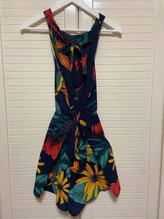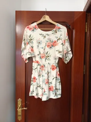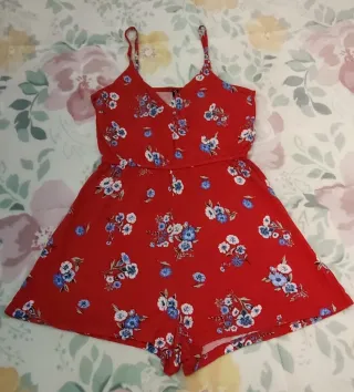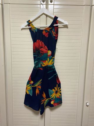 Mono corto de verano con estampado floral. Tela fresquita - Diseño cruzado en la parte delantera. - Tirantes finos ajustables. - Cintura elástica con detalle fruncido. Está sin usar
