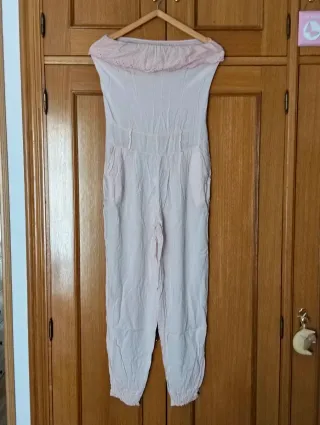 Mono corto de verano con tirantes finos. El color es un rosa suave y el tejido es ligero. - Cierre con lazada en la espalda. - Diseño de pierna ancha.