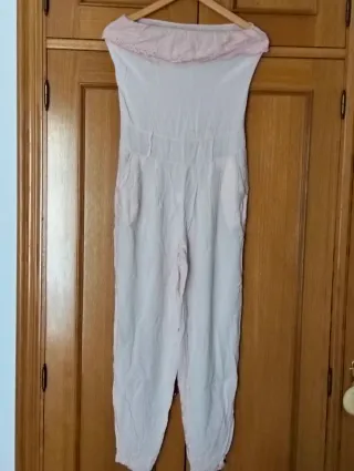Mono largo de mujer, ideal para el verano. Diseño sin tirantes con detalle de encaje en el escote. - Cintura elástica. - Bolsillos laterales. - Bajos de pantalón ajustados con elástico.