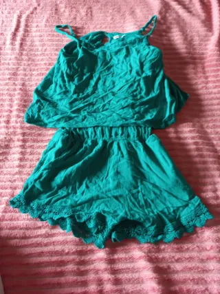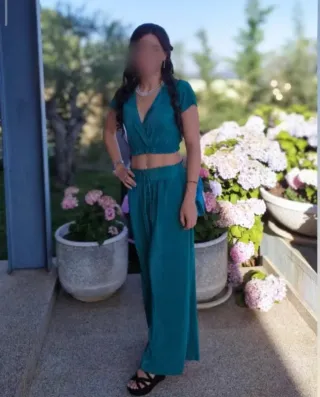 Elegante conjunto de dos piezas para ocasiones especiales. Color turquesa. - Top corto con escote cruzado. - Pantalón palazzo de cintura alta con cordón. - Tejido fluido y ligero. - La tela es brillante y con pliegues. Sienta maravilloso. Se usó en un evento. No necesita planchado. También se puede usar en un día a día de verano. Es una S/M. Está como nuevo.