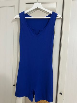 Mono corto de verano en color azul. - Tejido acanalado. - Escote en pico.