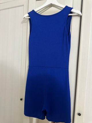 Mono corto de color azul vibrante con un diseño atrevido. - Escote halter. - Aberturas circulares en el torso.. - Cierre con botones. - Corte ajustado.