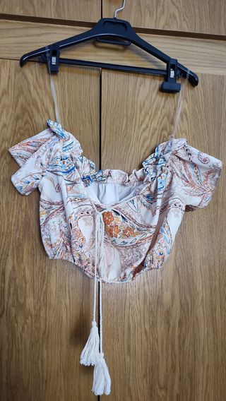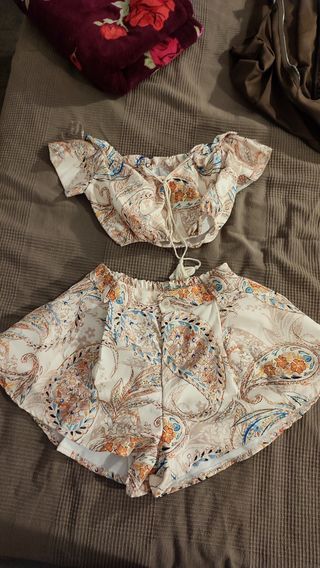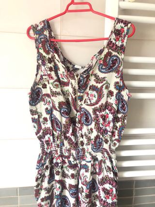 Precioso mono corto con estampado floral. Ideal para verano. - Escote hombros caídos. Tiene la goma algo pasada, quizá haya que ponerle una en el escote de cuello de barco. - Cintura con lazo. - Bajo con detalle de borlas. - Talla S Bershka - Usado unas horas.