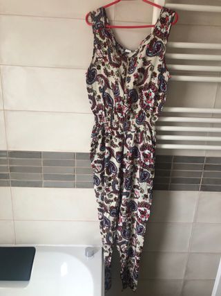 Precioso mono largo de mujer, ideal para verano. Está en perfecto estado. - Diseño floral con detalles étnicos. - Cintura elástica con cinturón. - Corte amplio y cómodo. - Escote en V.