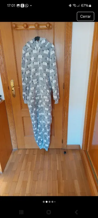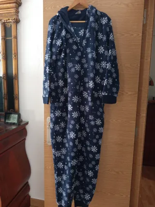 Mono de pijama suave y cómodo, ideal para estar en casa. Tiene capucha y cierre de cremallera. - Material: Tejido de felpa. - Diseño: Mono completo con mangas largas y perneras. - Cierre: Cremallera frontal.