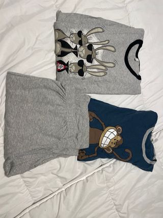 Conjunto de pijama para caballero y camiseta. - Camiseta gris con estampado de conejos. - Camiseta azul con estampado de mono. - Talla XL.